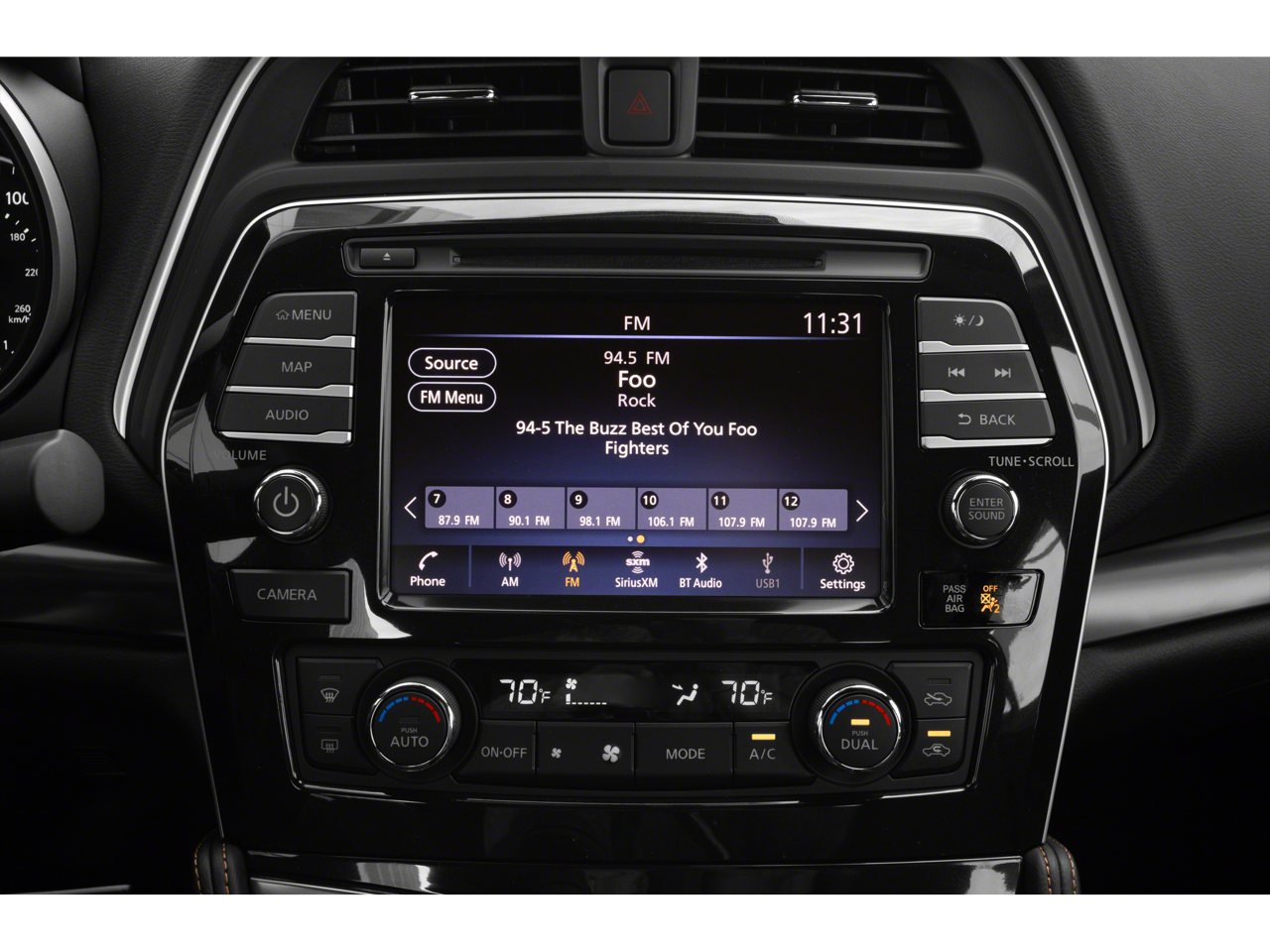 - Radio: AM/FM/CD Bose Audio System -inc: MP3/WMA/AUX reader, 11 speakers, NissanConnect featuring 8" color display w/multi-touch control, Apple CarPlay, Android Auto, 2 front illuminated USB connection ports (1 Type-A, 1 Type-C), Bluetooth® hands-free phone system, hands-free text messaging assistant, streaming audio via Bluetooth®, voice recognition, Siri Eyes Free, SiriusXM radio, SiriusXM advanced audio features, NissanConnect services powered by SiriusXM, Wi-Fi hotspot, Nissan door to door navigation, SiriusXM Traffic, SiriusXM Travel Link, display commander and 7" Advanced Drive Assist Display (ADAD)