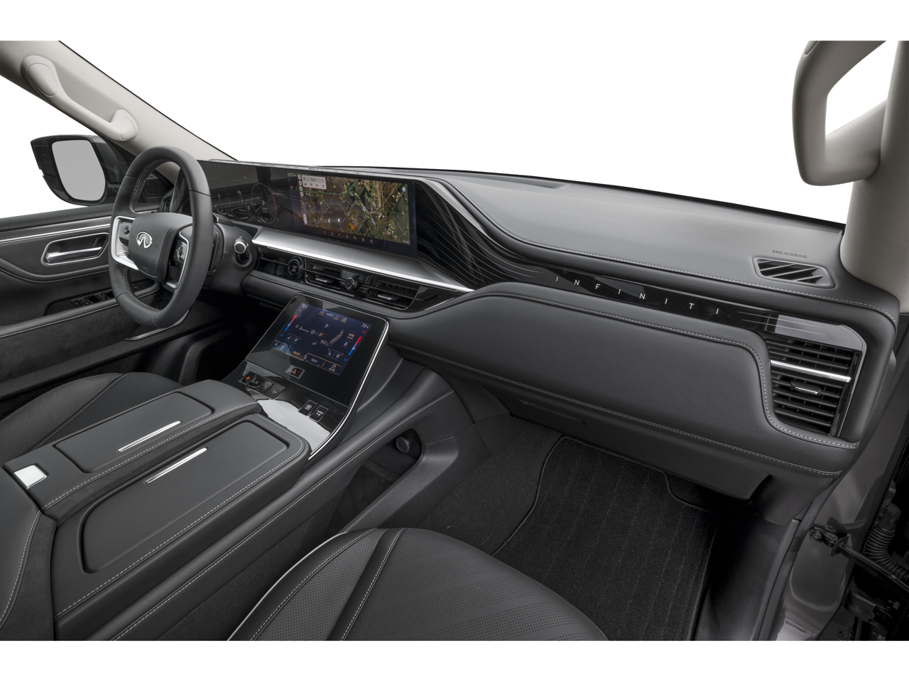 - Radio: Klipsch Premium Audio System w/14 Speakers -inc: Active Sound Enhancement (ASE), demo mode, dual 14.3" infotainment screens w/9" front control panel, INFINITI InTouch services, 4G Wi-Fi hotspot, Google built-in w/navigation, Amazon Alexa built-in w/hotword, Bluetooth® hands free phone and audio streaming, wireless Apple CarPlay and Android Auto, hybrid radio, SiriusXM w/360L (3-month trial included) and 2 USB type-C ports